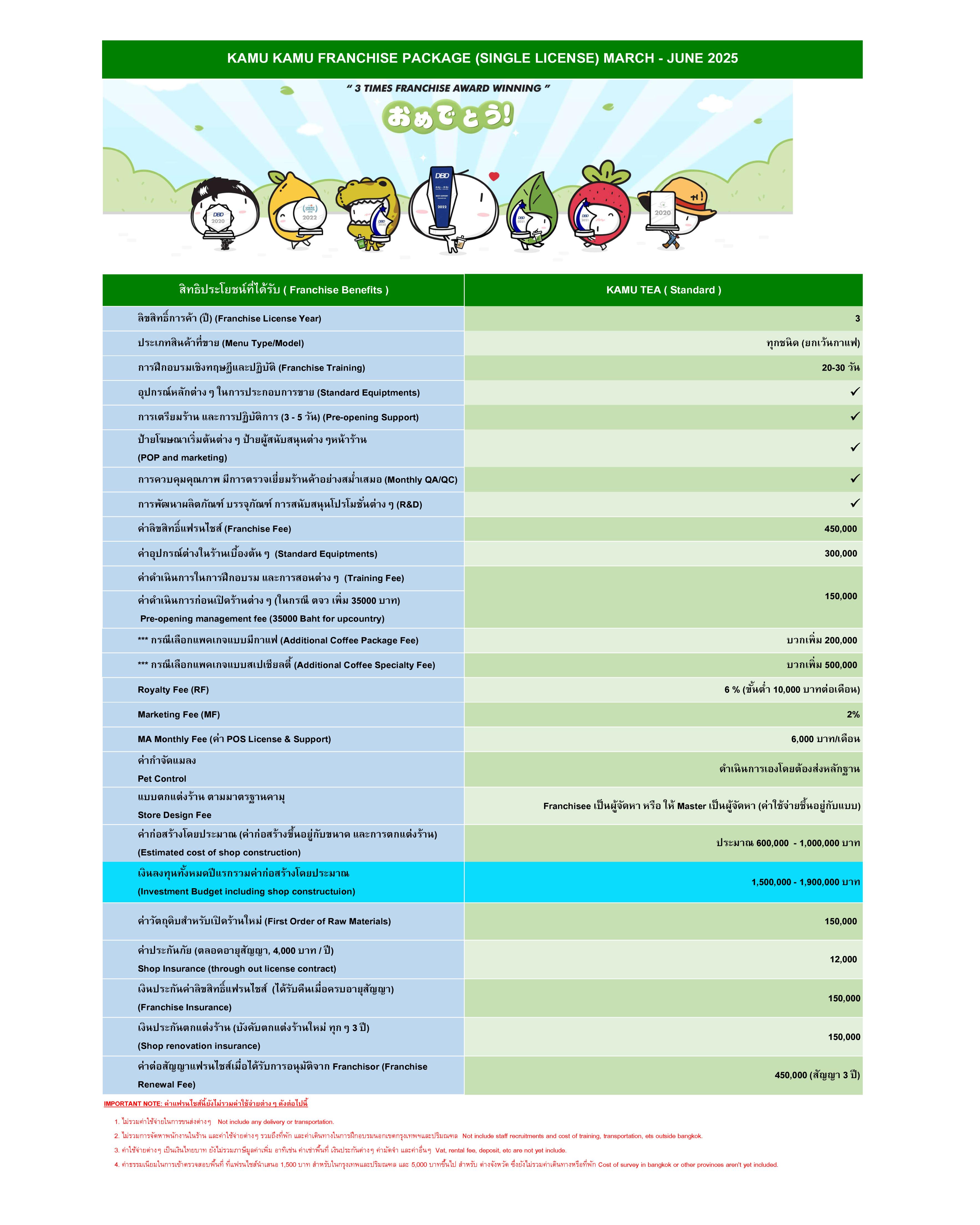 - สนใจสมัครเป็นเจ้าของธุรกิจแฟรนไชส์ ติดต่อได้ที่ 092-131-3082 คุณน้ำผึ้ง (เวลาทำการ วันจันทร์ - วันศุกร์ เวลา 9:00 - 18:00 น.)